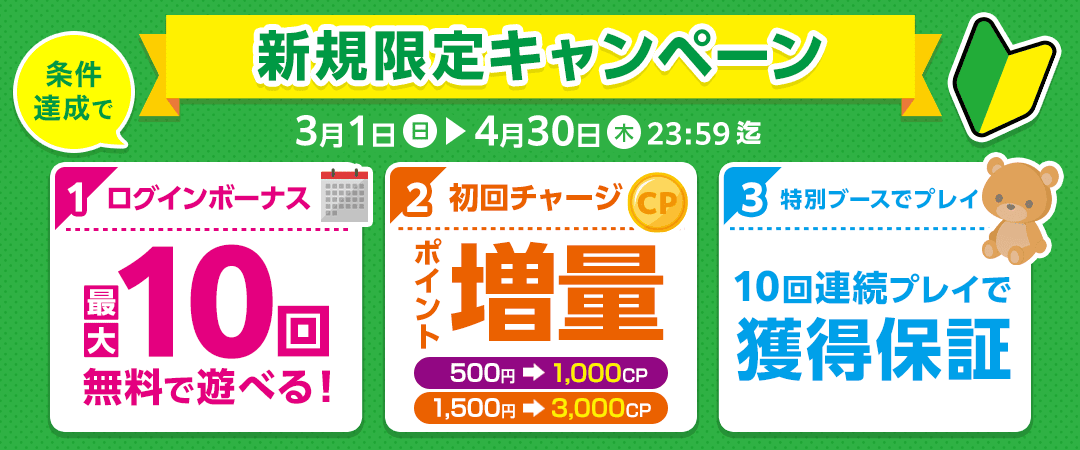 ご新規様限定ブースでは、お得な料金で景品がご獲得いただけます。