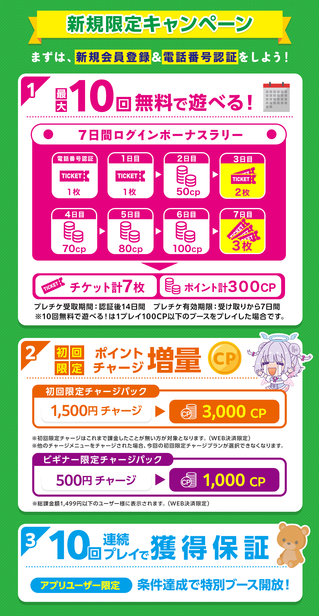 ・認証後に毎日ログインで合計『プレイチケット7枚』+『ポイント300CP』がもらえます。
